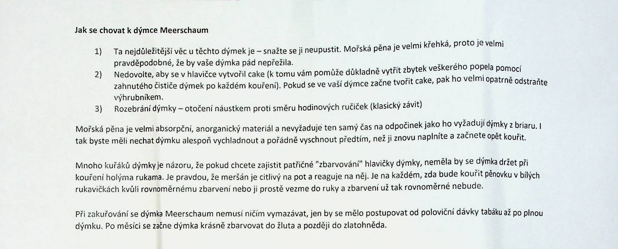 Dýmky Meerschaum jsou dodávány v elegantní dárkové krabičce, což z nich dělá ideální dárek pro každého milovníka dýmek. Doporučuje se při kouření dbát na přímý kontakt dýmky s pokožkou, protože Meerschaum reaguje na pot a může ovlivnit rovnoměrné zbarvení povrchu. Pro precizní vzhled lze používat bílou rukavičku, ale záleží na osobní preferenci kuřáka.