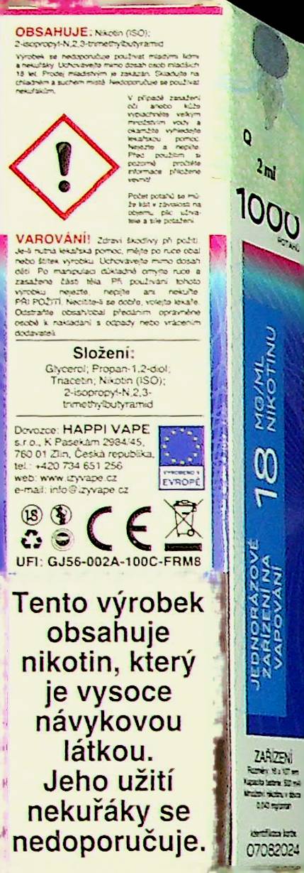 - Složení e-liquidu: PG, VG, nikotin, přírodní příchuť