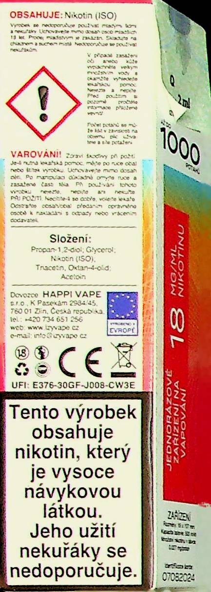 - Složení e-liquidu: PG, VG, nikotin, přírodní příchuť