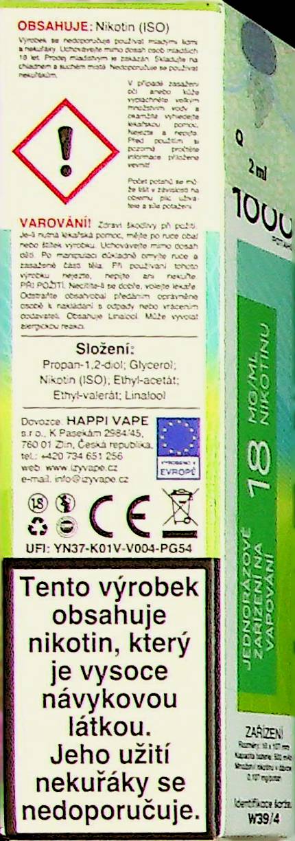 - Složení e-liquidu: PG, VG, nikotin, přírodní příchuť