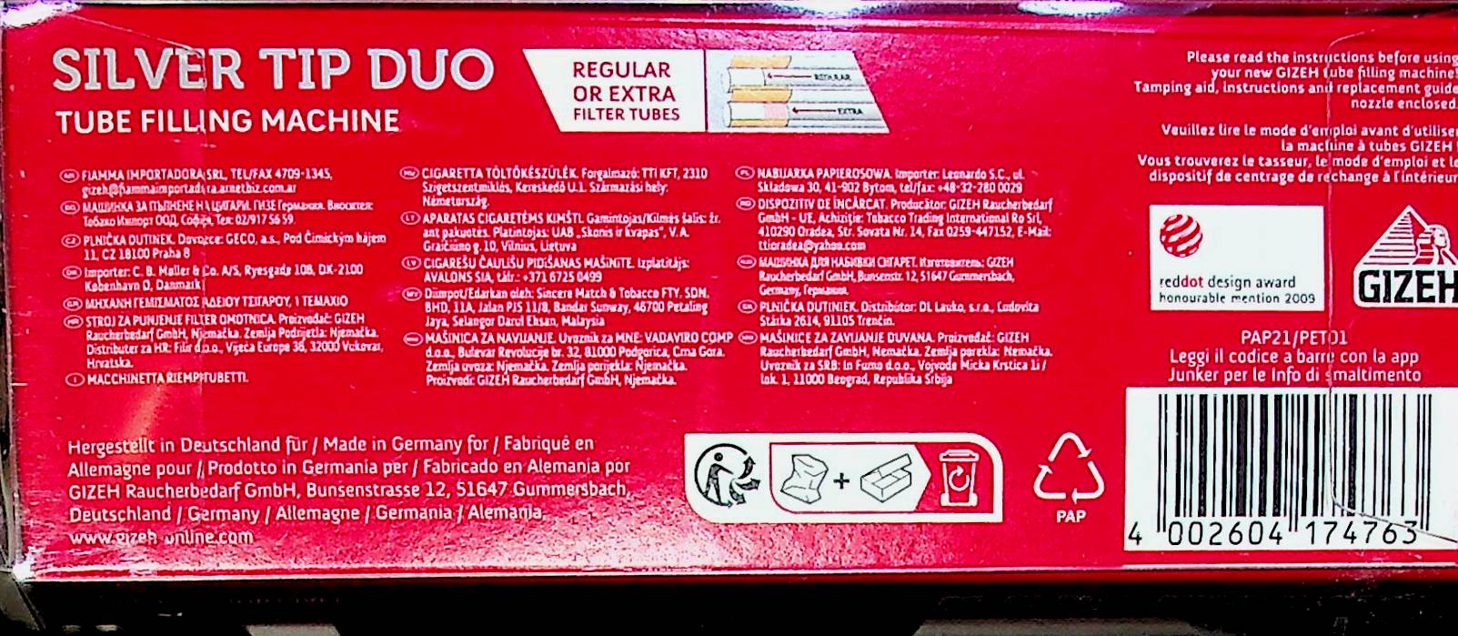 Díky svému kvalitnímu zpracování a jednoduchému ovládání je Gizeh Silver Tip DUO perfektní volbou jak pro začátečníky, tak pro zkušené uživatele. Umožňuje pohodlné a precizní plnění, čímž zajišťuje dokonalý výsledek a maximální pohodlí při tvorbě vlastních cigaret.