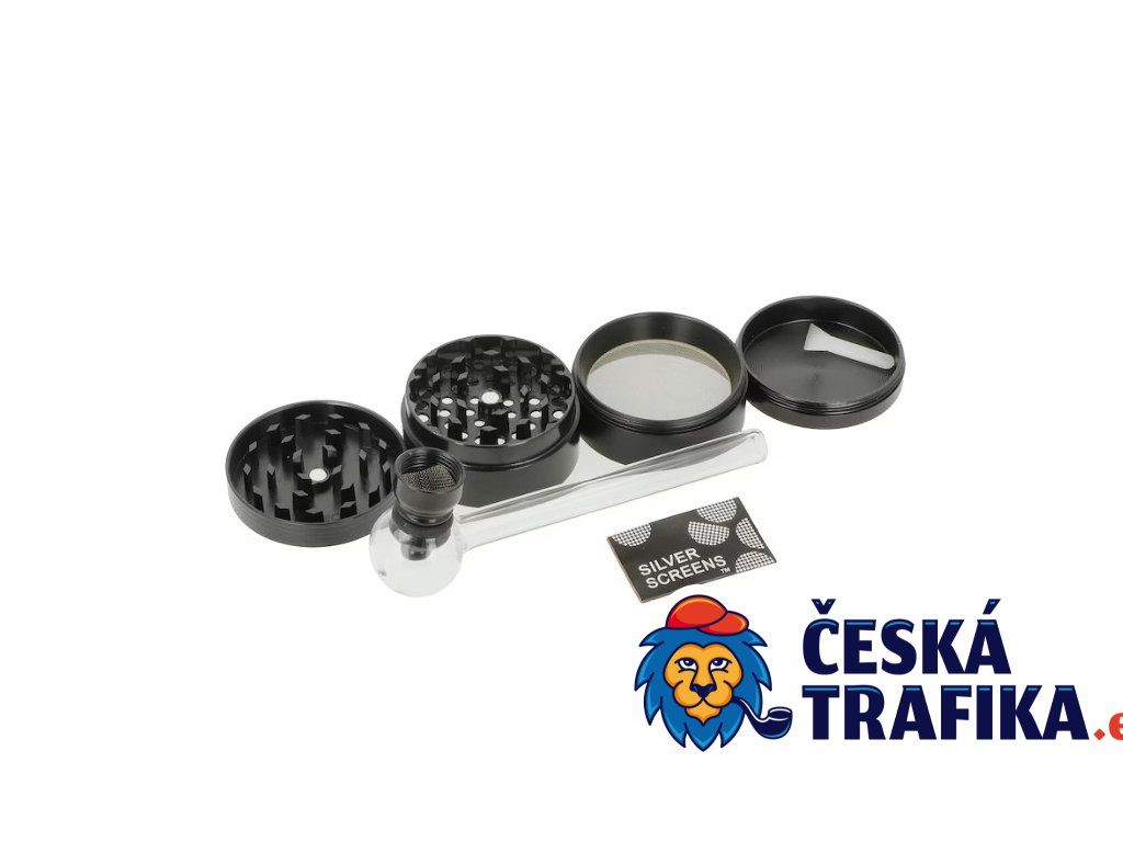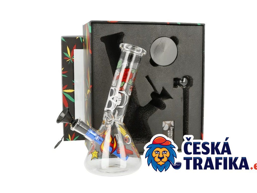 Hlavním lákadlem této sady je skleněný zalomený Ice bong o výšce 18 cm. Je vyroben ze 4 mm silného transparentního borosilikátového skla a osazen kovovým chillumem se šroubovacím kotlíkem. Oproti základním sadám zde najdete vylepšené příslušenství – čtyřdílnou kovovou drtičku v černé barvě, která precizně nadrtí vaše byliny, a kompaktní skleněnou šlukovku s odnímatelným kovovým kotlíkem pro chvíle, kdy preferujete menší dýmku.