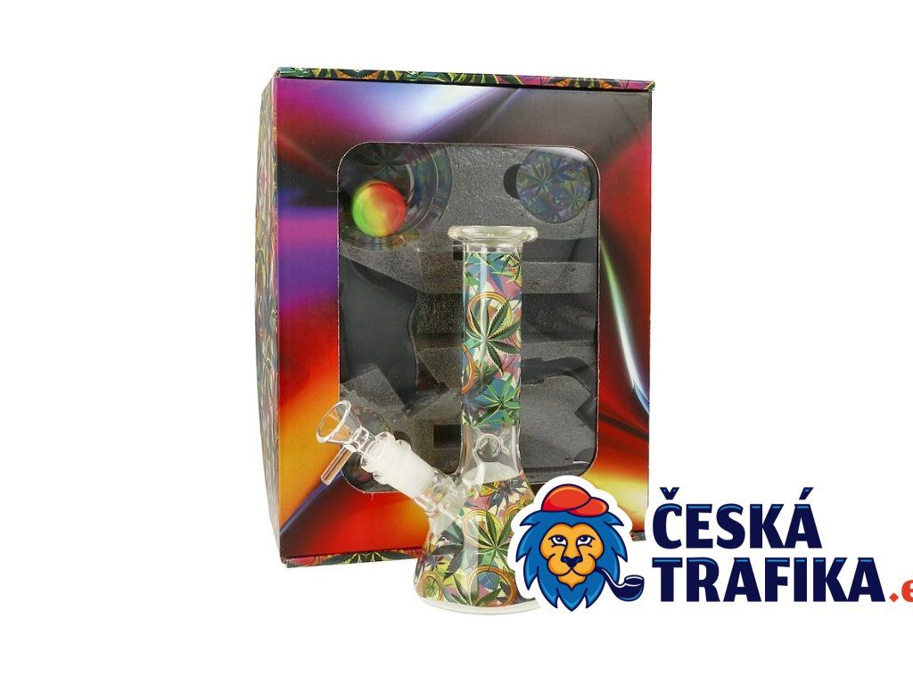 Hlavní hvězdou je rovný skleněný Ice bong o výšce 21 cm, vyrobený z kvalitního borosilikátového skla a zdobený stylovým motivem barevných konopných listů. Jeho největší předností je univerzálnost. Díky přibalenému klasickému i speciálnímu olejovému kotlíku jej během vteřiny proměníte z bongu na suché byliny v plnohodnotný nástroj pro dabbing tekutých extraktů, vosků (wax) či olejů.