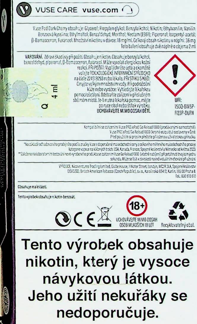 VAROVÁNÍ. Zdraví škodlivý při požití. Obsahuje nikotin. Obsahuje benzylalkohol, benzylaldehyd, piperonal, β-Damascenon a furaneol. Může vyvolat alergickou kožní reakci. PŘI POŽITÍ: Vypláchěte ústa a okamžitě volejte TOXIKOLOGICKÉ INFORMAČNÍ STŘEDISKO na čísle 224919293 nebo lékaře. PŘI STYKU S KŮŽÍ: Omyjte velkým množstvím vody. Při podráždení kůže nebo vyrážce: Vyhledejte lékařskou pomoc/ošetření. Odstraňte zařízení v příslušném sběrném místě. Je-li nutná lékařská pomoc, mějte po ruce obal nebo štítek výrobku. UCHOVÁVEJTE MIMO DOSAH DĚTÍ.